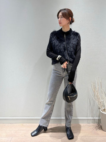 インナーにはハイゲージのタートルネックニットを選び、シアー素材を取り入れたアイテムはコーディネートにトレンド感をプラス。ブラックをベースにしたシンプルなデザインなので、ニットジレとの相性も良く、レイヤードスタイルが楽しめます。