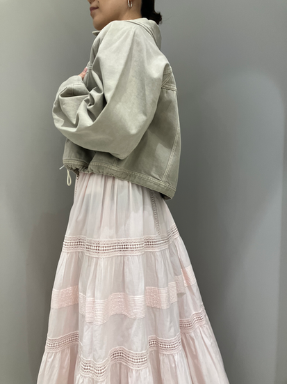 ふんわりボリュームのスカートにデニムジャケットを合わせた
