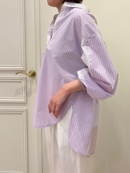 やさしいピンクラベンダーカラーのストライプシャツに、