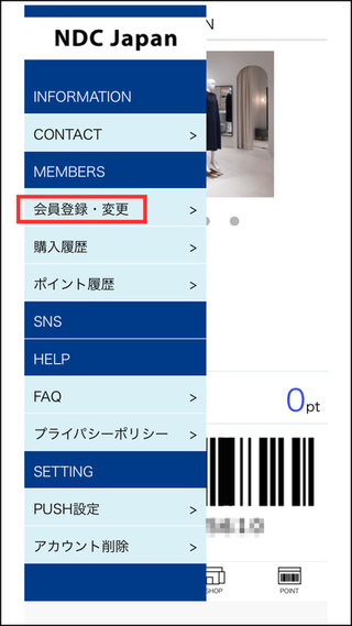 メニューが表⽰されるので、 「 会員登録・変更 」をタップ